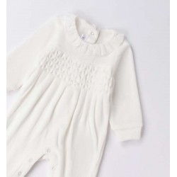 One-piece romper with front opening made of chenille with ruffles, embroidery and appliqués